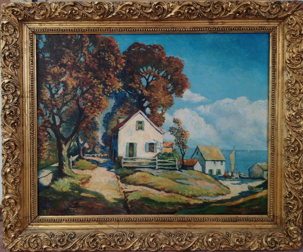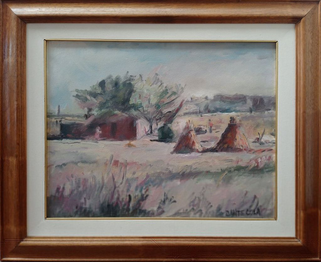 La obra representa una escena de campo con una casa roja, vegetación y pilas de heno o paja.