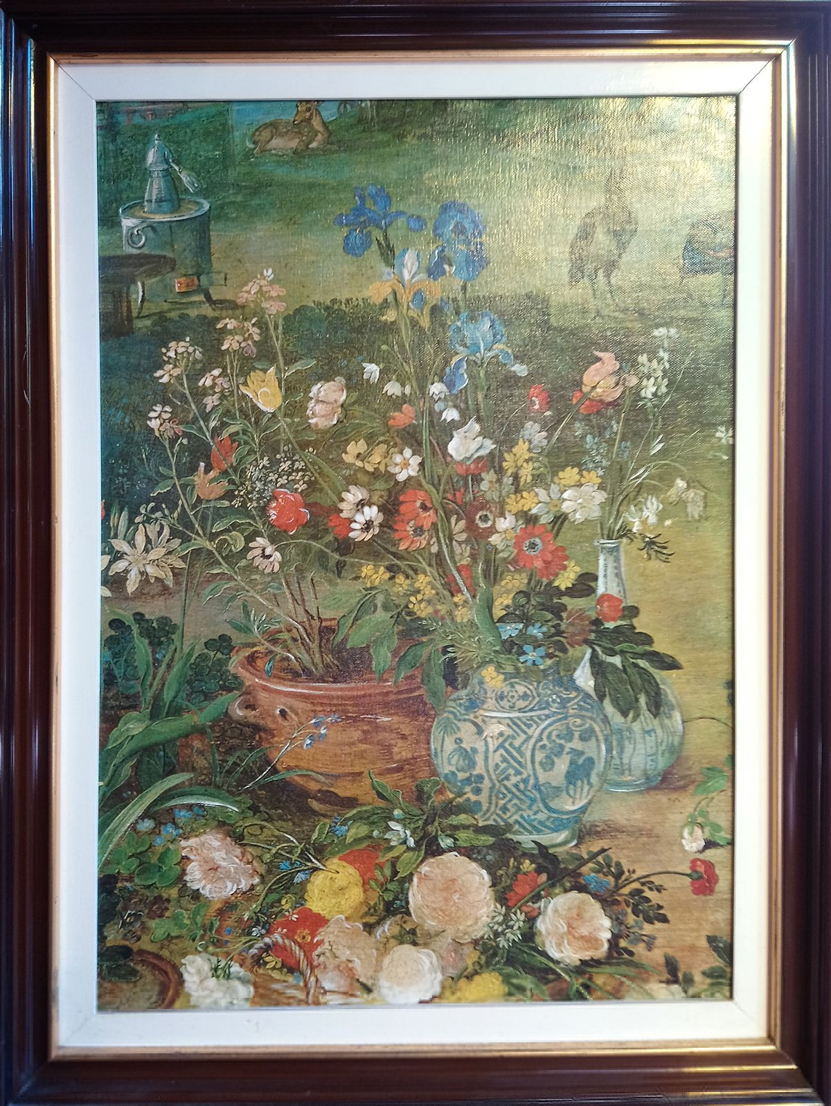 o “Still Life with Flowers in Chinese Vase and Deer in Background”